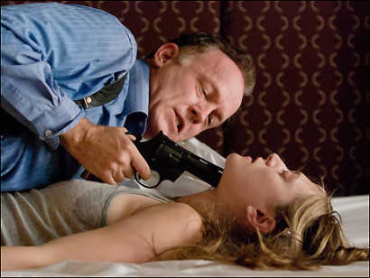 Blasted starts off with Ireland’s young Cate and Birney’s much older Ian entering a rather typical (if a bit more upscale) hotel room in Leeds. Through Kane’s sparse but vitriolic dialogue, we also find out that the two characters used to be lovers. Ian tries to coax Cate into bed with him, the latter resistant at first. By the second scene, we find Cate lying in a blood-stained bed, evidence that Ian had had his way with her, after all. Cate, realiing what had transpired the night before, comes to her sense and defends herself against Ian and escapes out the bathroom window. Meanwhile, a knock on the door brings about Cancelmi’s soldier, who is unnamed. After the soldier interrogates Ian and threatens hum with a gun, the hotel is blasted with a bomb.